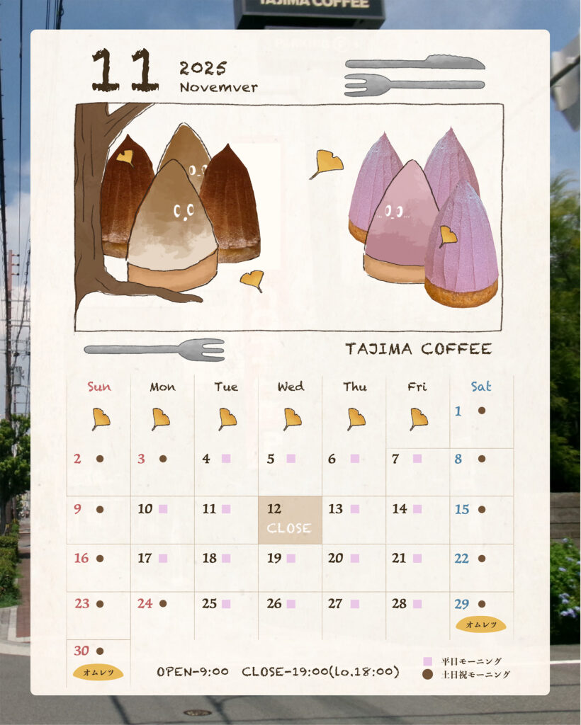 TAJIMA COFFEEの11月の営業カレンダーです。 11月は芋、栗スイーツがメインです🍠🌰 ぜひお楽しみに✨ クリスマスケーキのご予約も中旬ごろから開始予定です🎅もう少々お待ちくださいませ。 ※12日(水)は臨時休業となります。 お知らせ URLをコピーしました! URLをコピーしました! 季節のショートケーキ〜和栗〜 丹波栗のモンブラン