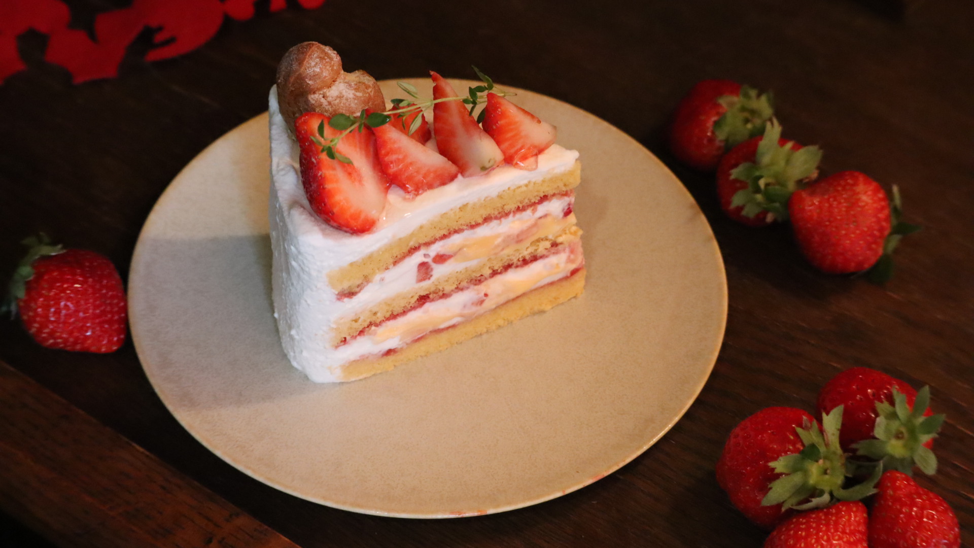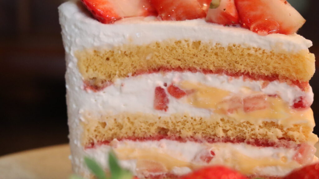 ふわふわのスポンジ生地に、甘酸っぱいイチゴとカスタードをたっぷりとサンドしました。