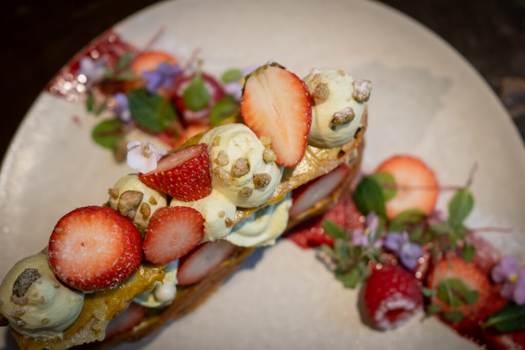 サクサクのシュー生地にラズベリーとブラックベリーの自家製コンフィチュール、BABBIの濃厚ピスタチオのカスタード、たっぷりの完熟イチゴを並べて